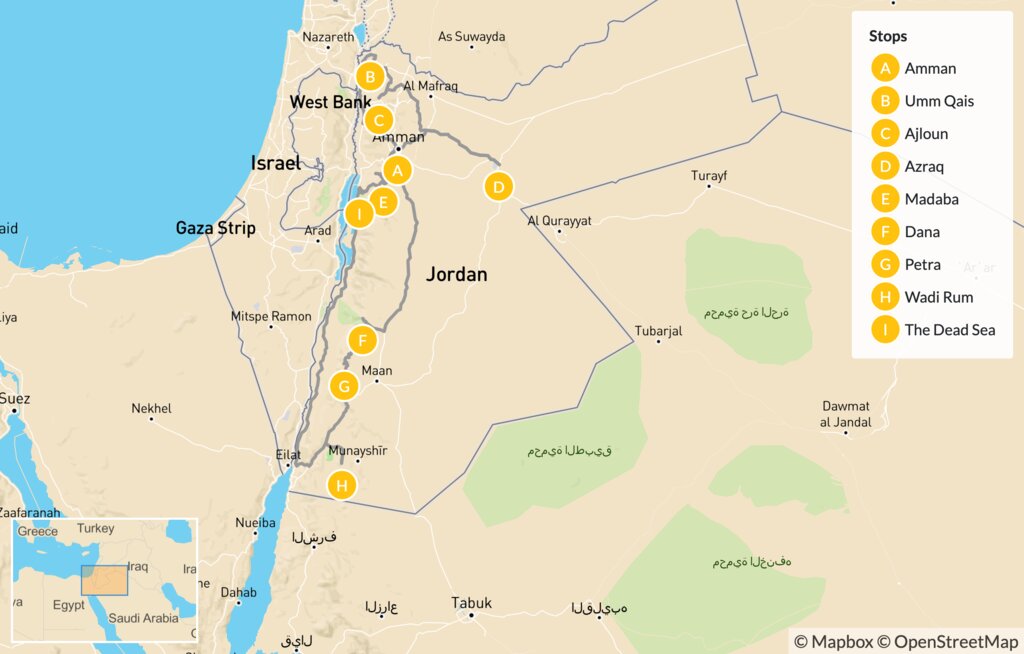Map of History & Heritage Tour of Jordan: From Amman to the Dead Sea – 16 Days