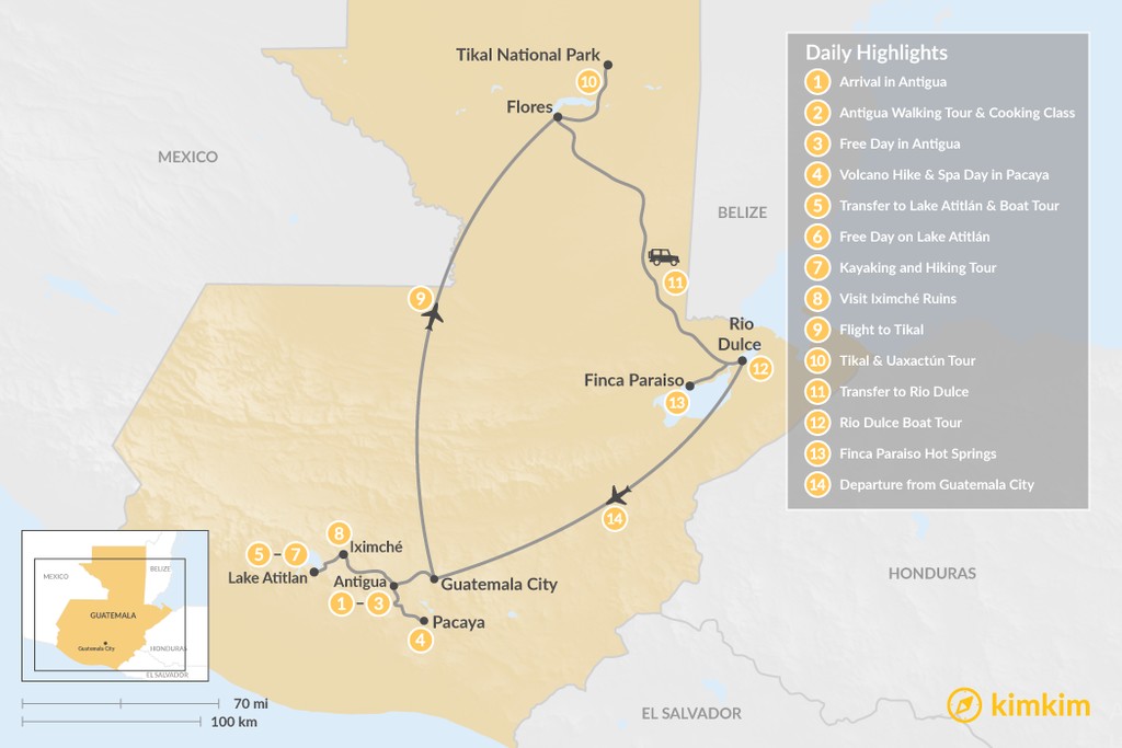 Map of Honeymoon in Guatemala: Antigua, Atitlán, Tikal & Río Dulce – 14 Days