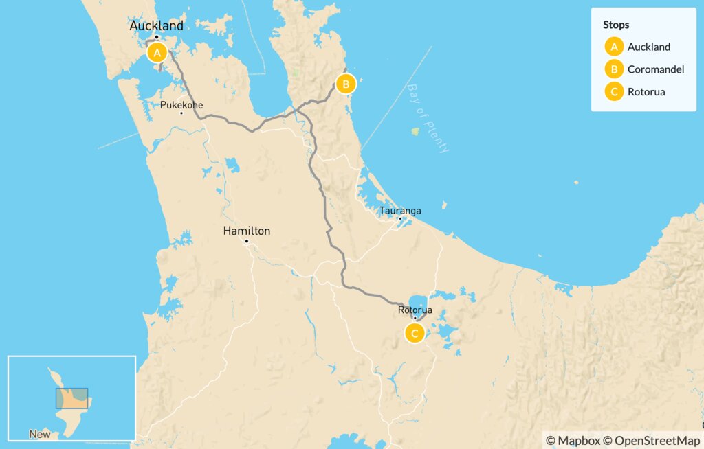 Map of Honeymoon Road Trip Escape to New Zealand’s North Island – 7 Days