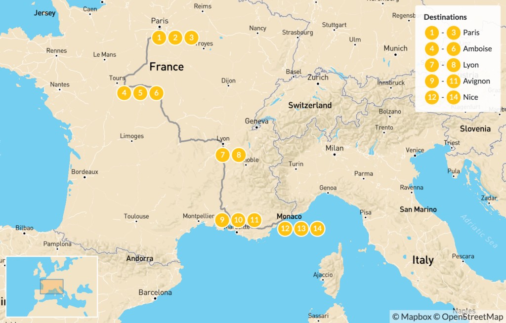 Map of Honeymoon Romance in France: Paris, Lyon, Avignon, & the French Riviera – 15 Days