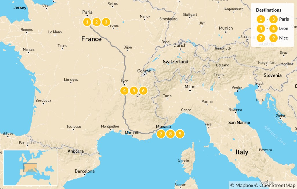 Map of Honeymoon Romance in France: Paris, Lyon & the French Riviera – 10 Days