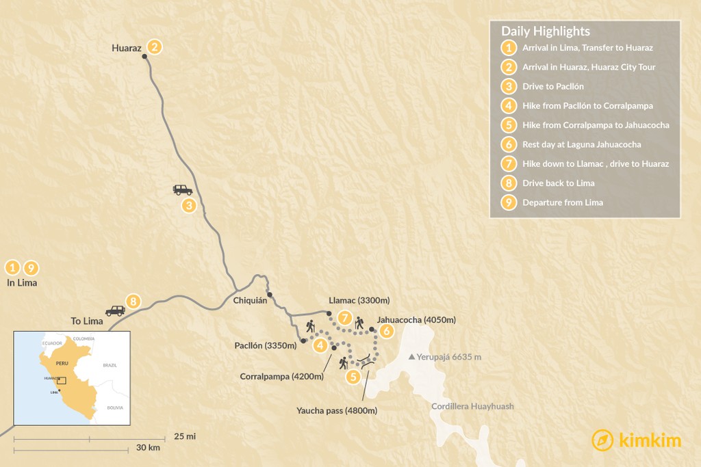 Map of Huaraz & Cordillera Huayhuash Trekking – 9 Days