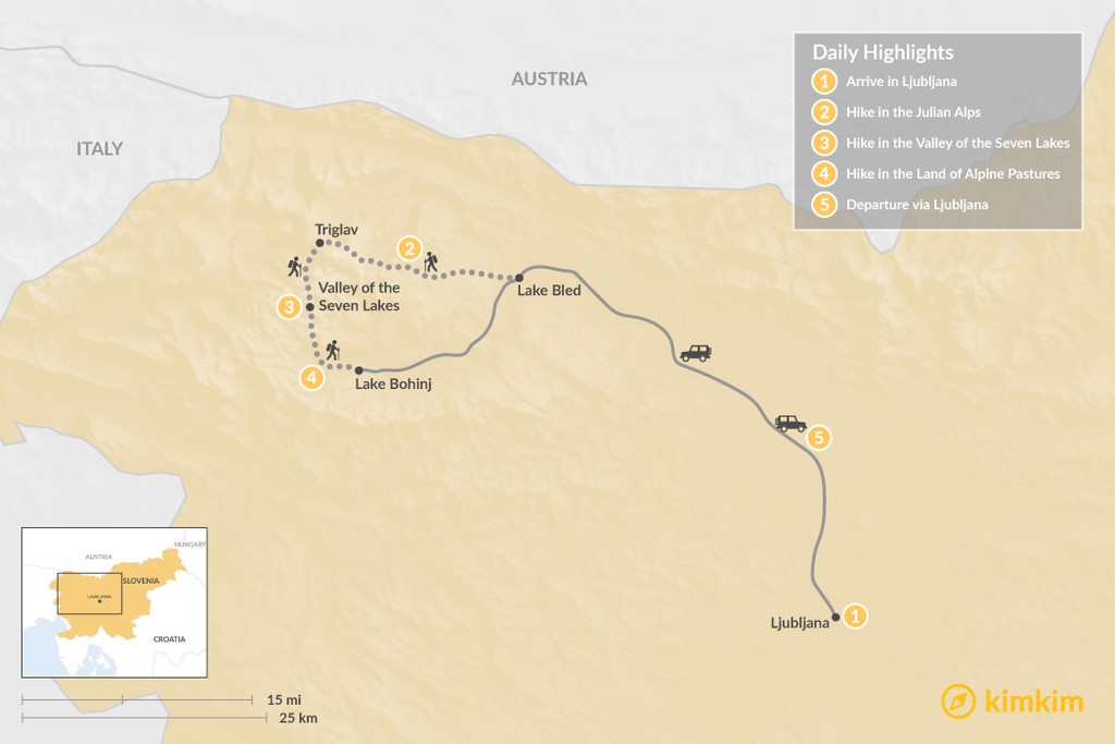Map of Hut-to-Hut Hiking in the Slovenian Alps- 5 Days