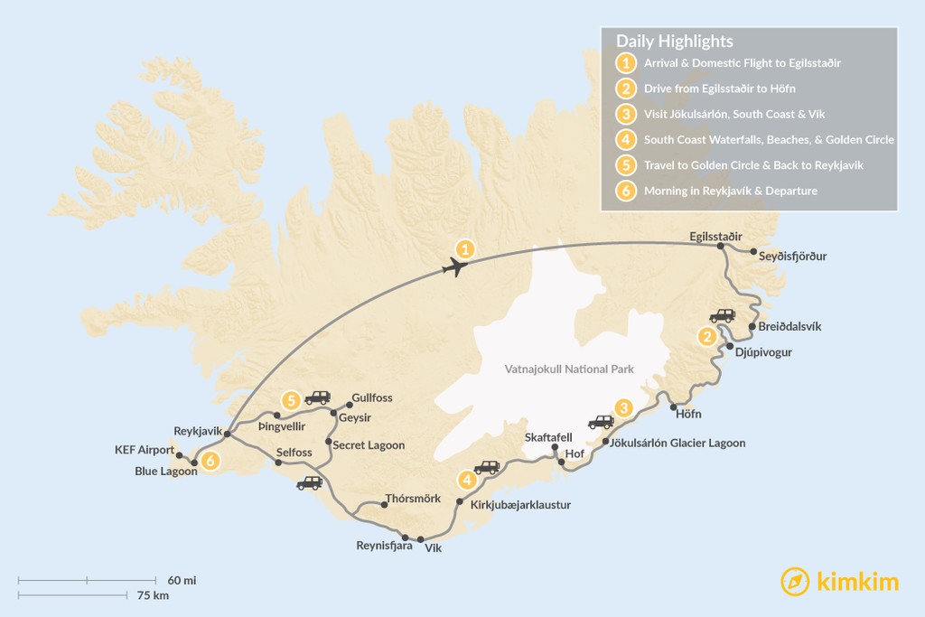 Map of Iceland: East Fjords, South Coast, & Golden Circle – 6 Days