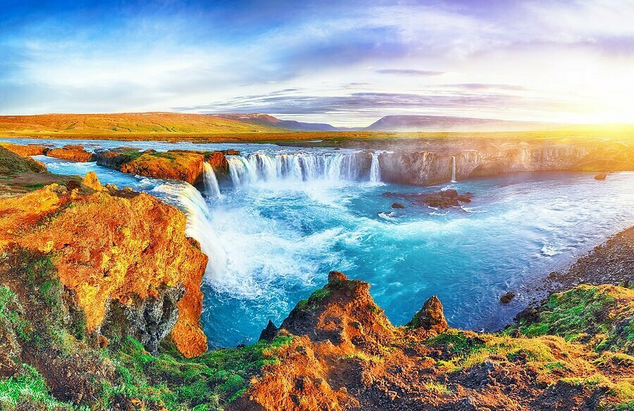 Today, you’ll come around the top of Iceland and continue down into the northwest part of the country. It’s only about a 45-minute drive south of Húsavík to the first major landmark on today’s itinerary: Goðafoss. Known as the “Waterfall of the Gods,” the cascades here drop 39 feet (12 m) into a river gorge. Also, watch for seal colonies as you drive along the coast.