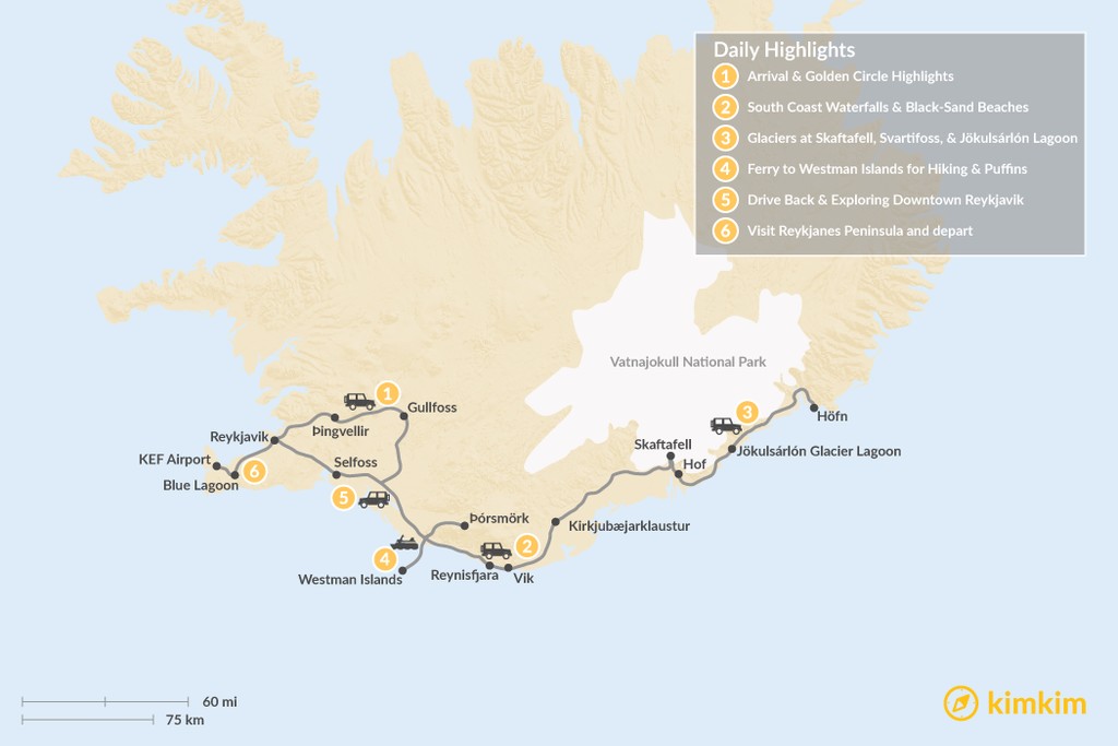 Map of Iceland: Golden Circle, South Coast, & Westman Islands – 6 Days