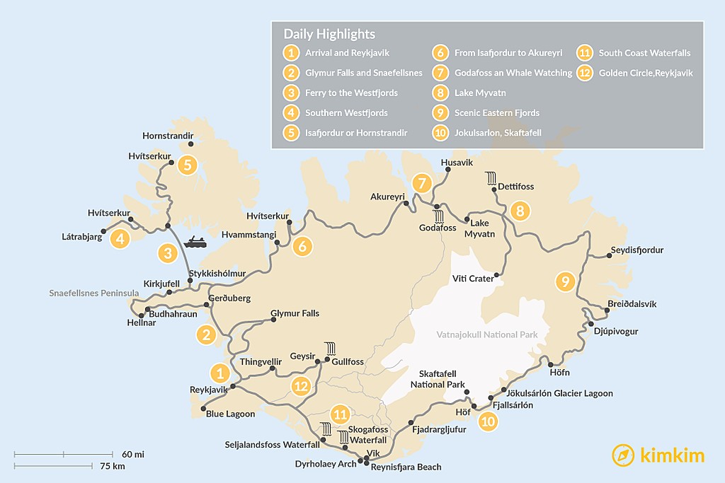 Map of Iceland Ring Road & Westfjords Adventure – 12 Days