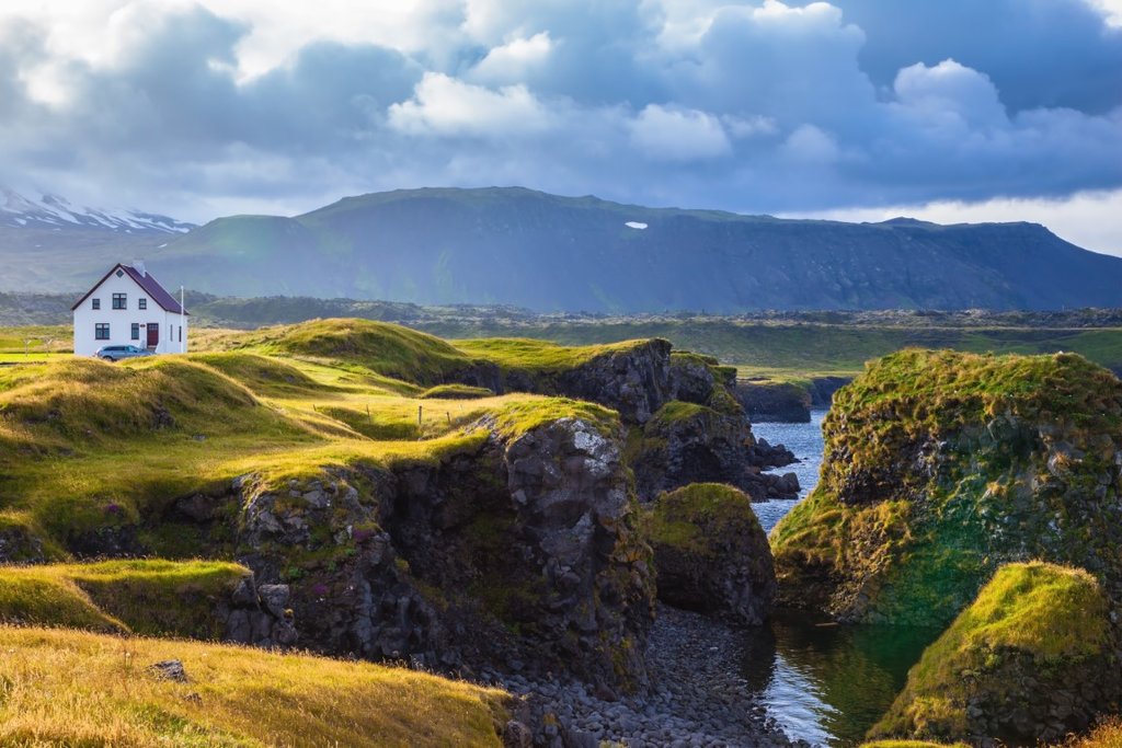 This morning, head north through West Iceland (which you’ll explore on day four) to the Snæfellsnes peninsula—often referred to as “Iceland in miniature” for its wealth of volcanic geological marvels. Upon arrival, you’ll have plenty of time for a clockwise drive around the 55-mile-long (90 km) peninsula, beginning with a stop at the iconic, black Búðakirkja church standing alone atop Budir beach. Continue west through the Budahraun lava field to Arnarstapi, where the natural sea arch is among many fantastical coastal formations stretching west to Lóndrangar, with its clifftop basalt pinnacles.