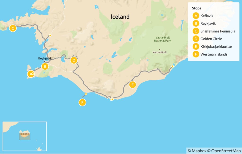 Map of Iceland South & West Coast Highlights: Snaefellsnes Peninsula, Golden Circle & Westman Islands – 11 Days