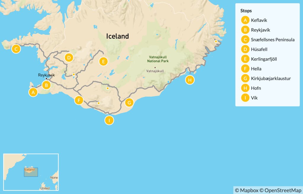 Map of Iceland Super Jeep Southern Highlands Tour – 16 Days