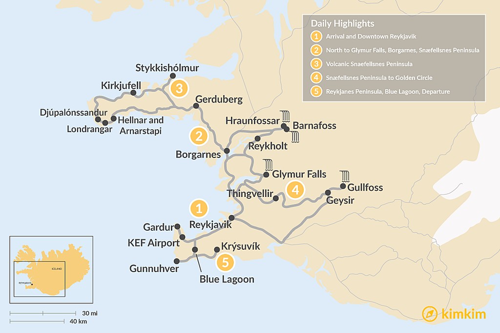 Map of Iceland West Coast & Golden Circle – 5 Days