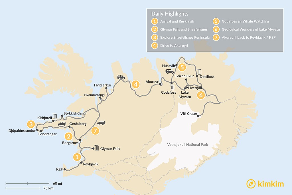 Map of Iceland’s Western & Northern Highlights – 7 Days