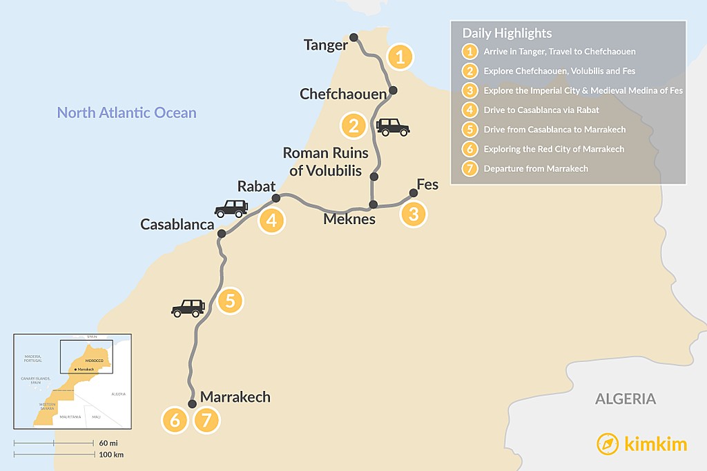 Featuring an exciting mix of culture and history, this complete one-week itinerary covers highlights of Morocco’s historic Imperial cities, Meknes, Fes, Rabat, and Marrakesh, with additional time dedicated to Tangier, Chefchaouen, and Casablanca. You’ll start in Tangier on the coast of the Strait of Gibraltar and work your way south to lively Marrakesh. Morocco’s exceptional architecture, ornate artisanship, delicious food, and bustling souks are sure to leave you charmed.
