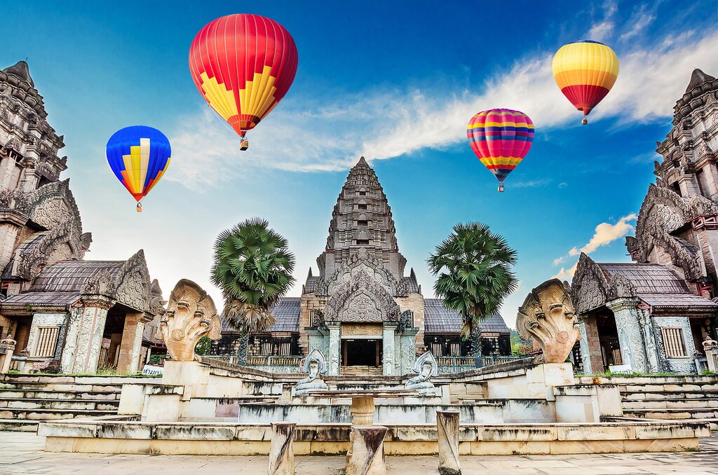 In the afternoon during the dry season (November-April), you can enjoy a panoramic view of Angkor Wat from a hot air balloon. Book your hot air balloon ride at either sunrise or sunset for the most atmospheric views over the landscape. As evening falls, go for dinner and a show at Kanell restaurant. Here you can try traditional Cambodian dishes and enjoy an Apsara dance show, a classical Khmer performance rooted in Hindu and Buddhist mythology. After dinner, head to Pub Street for a drink and visit the night market nearby.