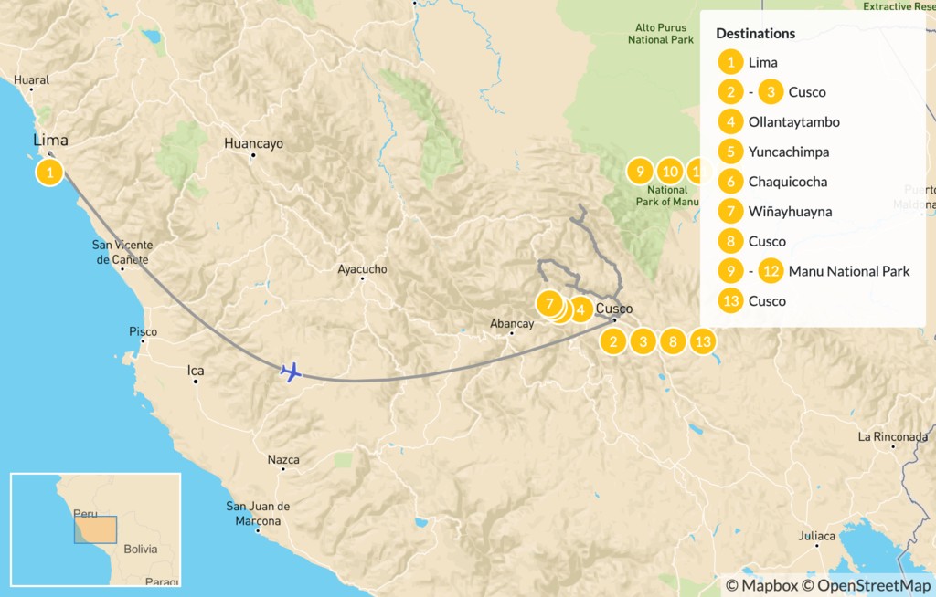 Map of Inca Trail & Amazon Adventure – 14 Days