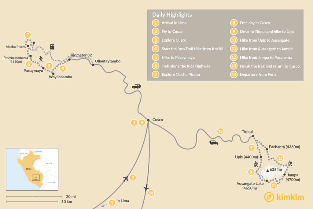 This itinerary covers the Inca Trail in 4 days, Ausangate in 5 days, and leaves 3 days at the beginning and in between (not including arrival and departure) to explore Cusco.