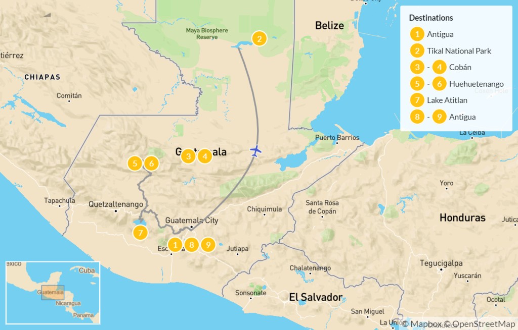 Map of Incredible Guatemala: Antigua, Tikal, Cobán & Huehuetenango – 10 Days