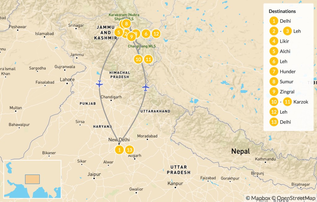 This unique two-week journey highlights a region in northern India known for Buddhist sites and outdoor activities. After a night in Delhi, you and your guide will fly to Jammu and Kashmir where you’ll acclimatize to the altitude while enjoying Himalayan culture in the town of Leh. Then, begin a series of hikes and scenic transfers to the area’s best temples, monasteries, valleys, and wildlife preserves—all while staying in friendly lodges and camps for the ultimate adventure.