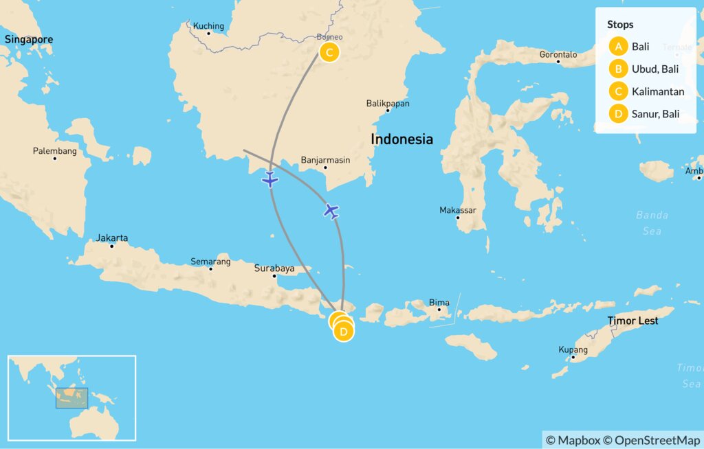 Map of Indonesia’s Nature, Culture & Wildlife: Bali & Borneo – 9 Days