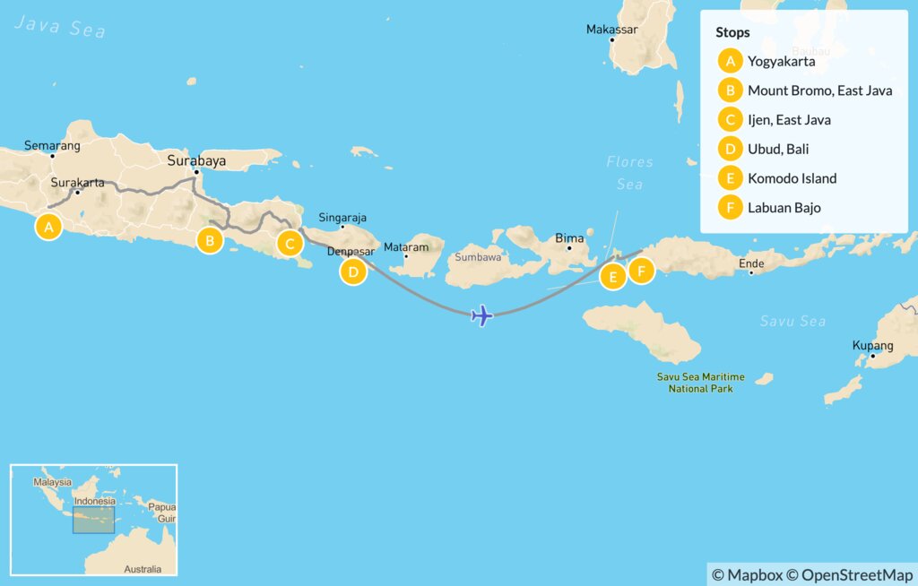 Map of Indonesia’s Volcanoes & Dragons: Mount Bromo, Mount Ijen, Bali & Komodo – 6 Days