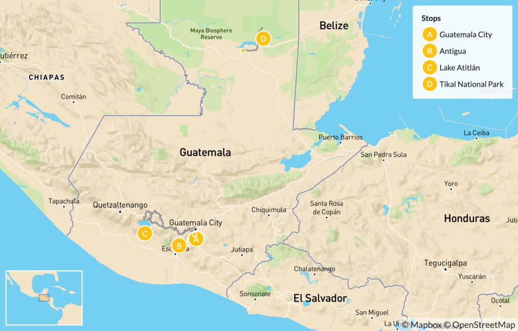 Map of Introduction to Guatemala: Antigua, Lake Atitlán & Tikal National Park – 11 Days