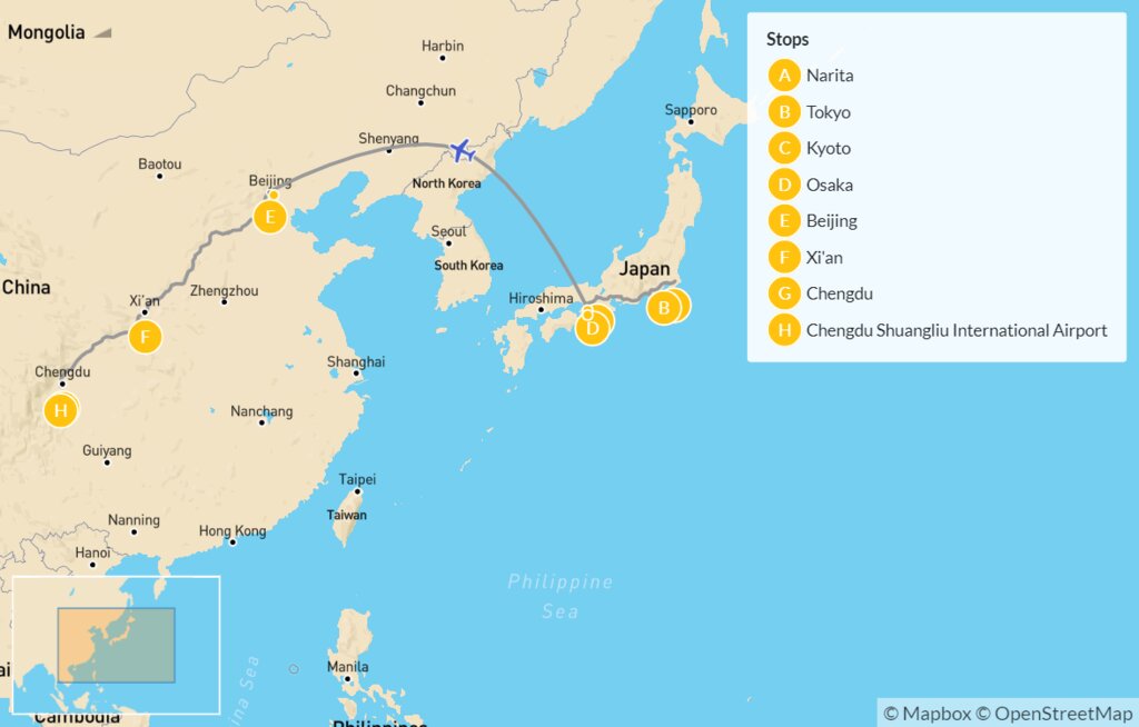 Map of Japan & China Culinary Tour: Tokyo, Kyoto, Osaka, Beijing, Xi’an & Chengdu – 14 Days
