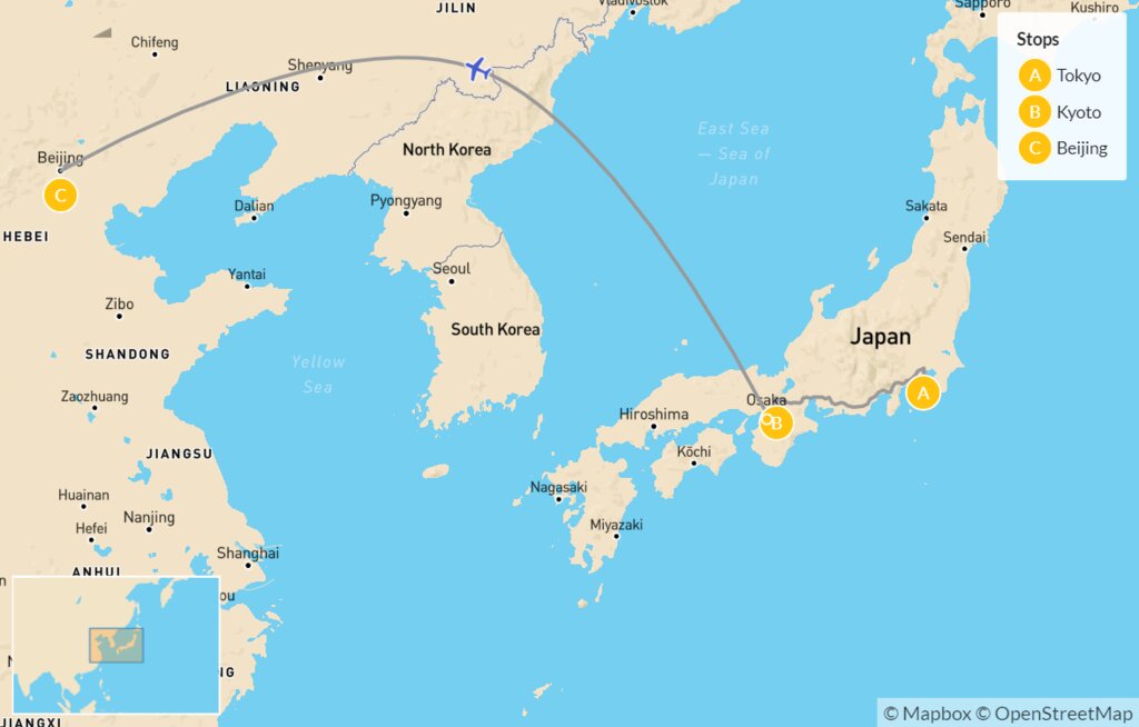 Map of Japan & China Cultural Discovery Tour: Tokyo, Kyoto & Beijing – 10 Days