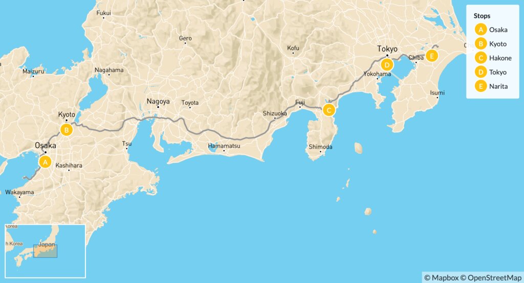 Map of Japan City & Nature Tour for Families: Osaka, Kyoto, Hakone & Tokyo – 14 Days