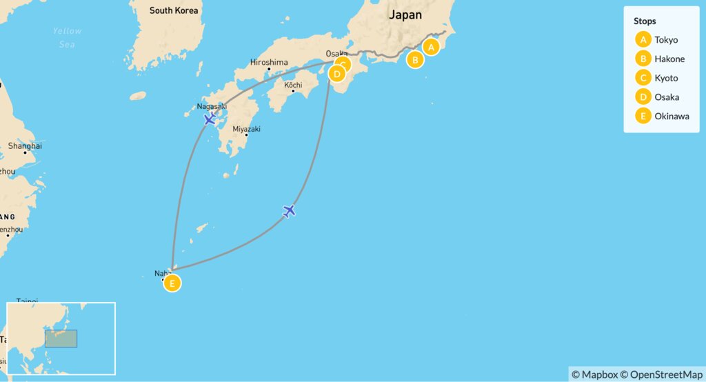 Map of Japan Cityscapes, Culture & Beaches Tour – 14 Days