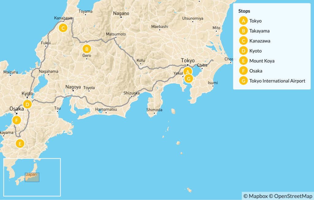 Map of Japan Cultural Discovery Tour: Tokyo, Kyoto, Mount Koya & Osaka – 16 Days