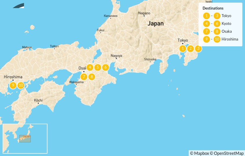 Map of Japan’s Big Four: Tokyo, Kyoto, Osaka & Hiroshima – 10 Days