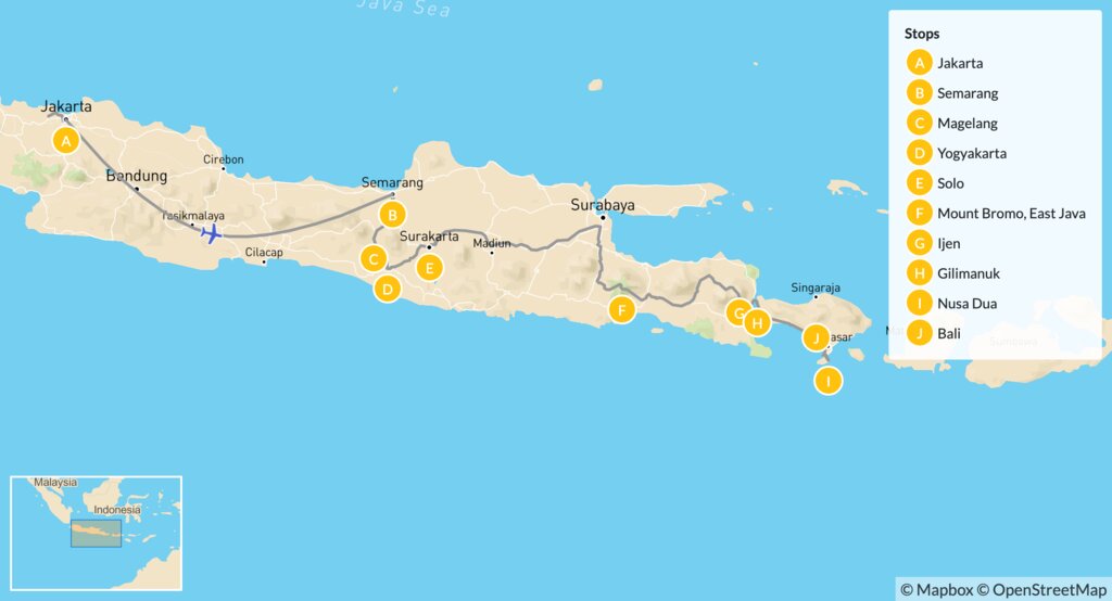 Map of Java to Bali Overland Adventure & Island Stay – 15 Days