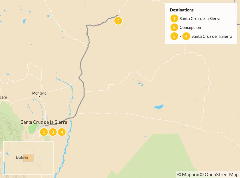 | Day 1 | Arrive in Santa Cruz de la Sierra | Santa Cruz de la Sierra |
