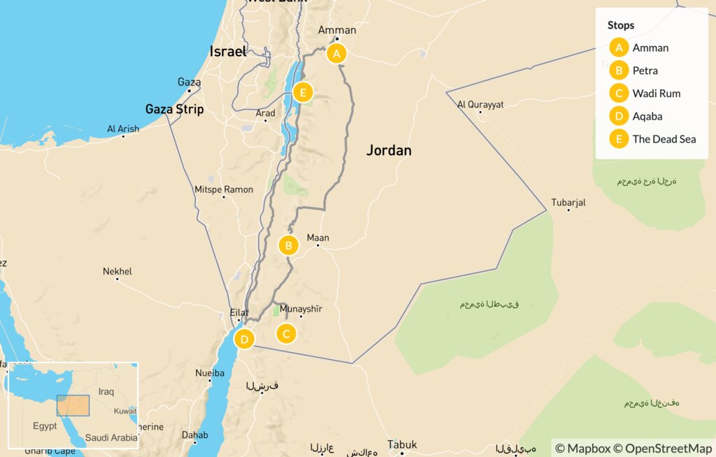 Map of Jordan Grand Tour: Amman, Petra, Wadi Rum, Aqaba & the Dead Sea – 15 Days