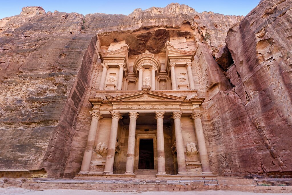 Today, you’re free to explore Petra at your own pace. Enter the archaeological site through the Siq, a narrow canyon flanked by towering cliffs that leads to the iconic Treasury. Standing at 131 feet (40 m), the grand facade adorned with columns, statues, and elaborate details is carved out of a single block of red sandstone rock. Continue to the High Place of Sacrifice, which was used for religious ceremonies and animal sacrifices conducted to honor the gods. Although climbing the steep, ancient stone staircase can be challenging, the panoramic view of Petra at the top will be worth it.