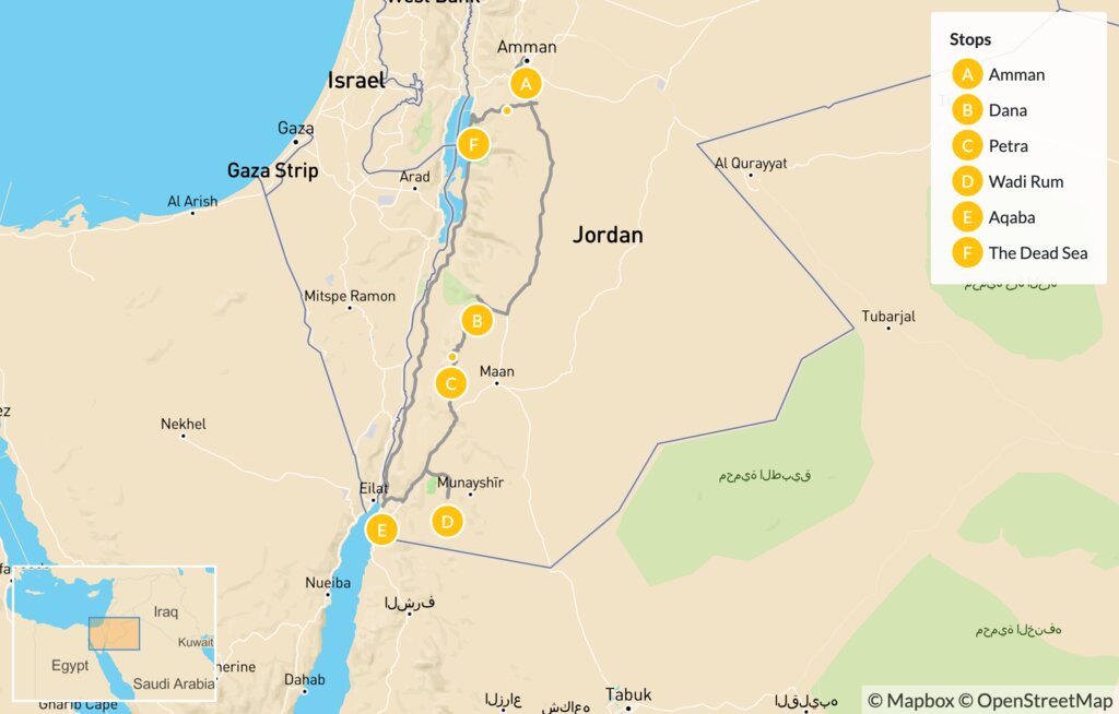 Map of Jordan’s Natural Wonders: Amman, Dana, Petra, Wadi Rum, Aqaba & Dead Sea – 11 Days