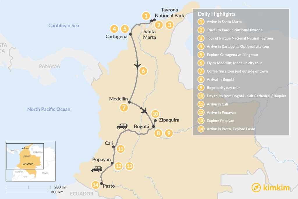 The trip starts on the northern Caribbean Coast with time to explore Tayrona’s beautiful national park, sandwiched between the turquoise sea and rugged rainforested mountains. From here, you’ll spend a few days exploring the romantic UNESCO-listed inner-walled city of Cartagena, and then take a flight to the mountainous city Medellín, with a gondola, spring-like temperatures, and thriving arts and culture scene. Then, you’ll visit a coffee farm before heading to the vibrant capital of Bogotá with two days to get to know this buzzing capital with new boutique hotels and. Continue the journey with a flight to Cali, the salsa capital of the world. Keep driving south spending two nights in the “white city’ of Popayán, and finish the trip near Ecuador’s border, visiting Las Lajas Sanctuary, Colombia’s iconic basilica church built over a bridge on a canyon.