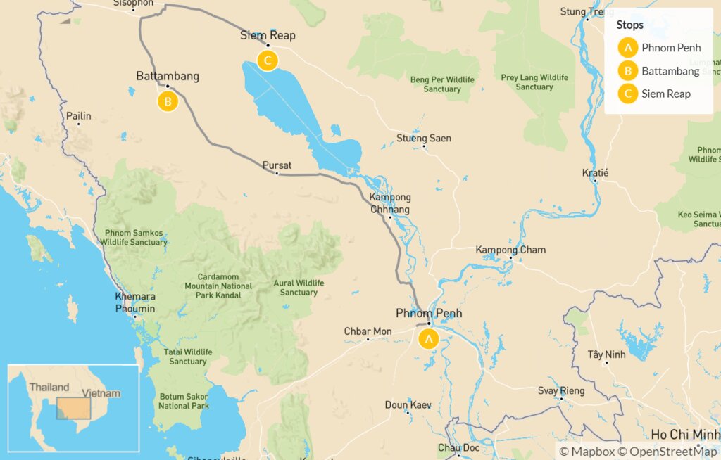 Map of Journey in Cambodia from Ancient Temples to Floating Villages – 9 Days
