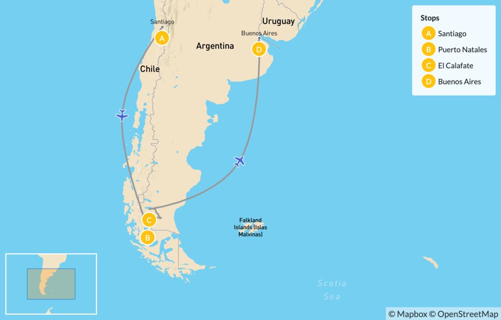Map of Journey Through Chilean & Argentine Patagonia – 10 Days