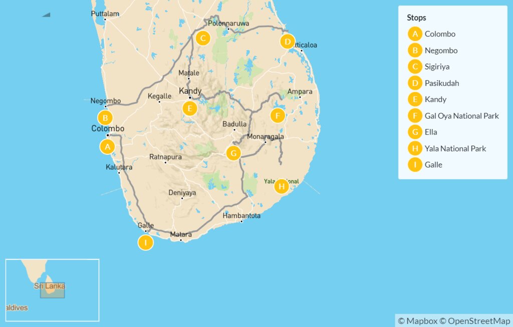 Map of Journey Through Sri Lanka: Beaches, Temples & Wildlife – 15 Days