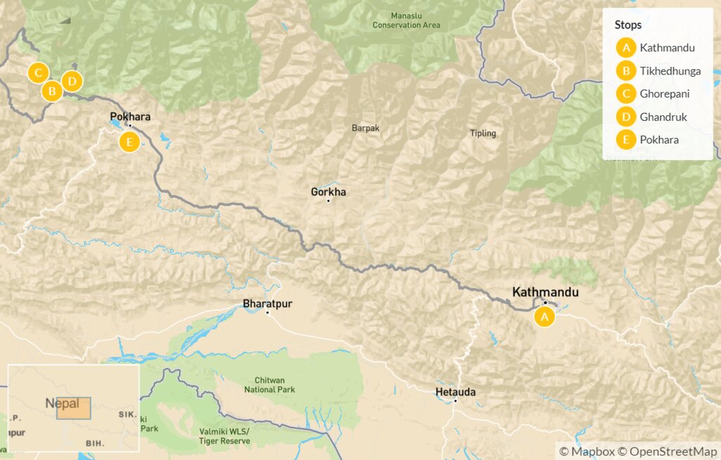Map of Journey to Kathmandu, Shivapuri Nagarjun National Park, Poon Hill & Ghorepani – 8 Days