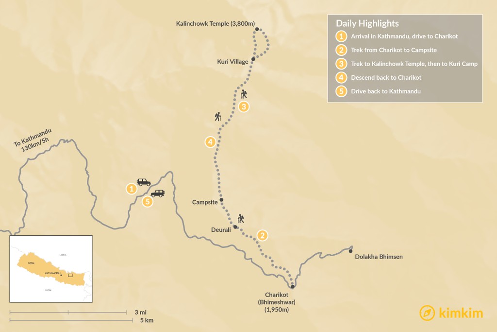 | Day 3 | Drive Kathmandu to Charikot | 1,515 m/5,101 ft; approx. 4 hrs |