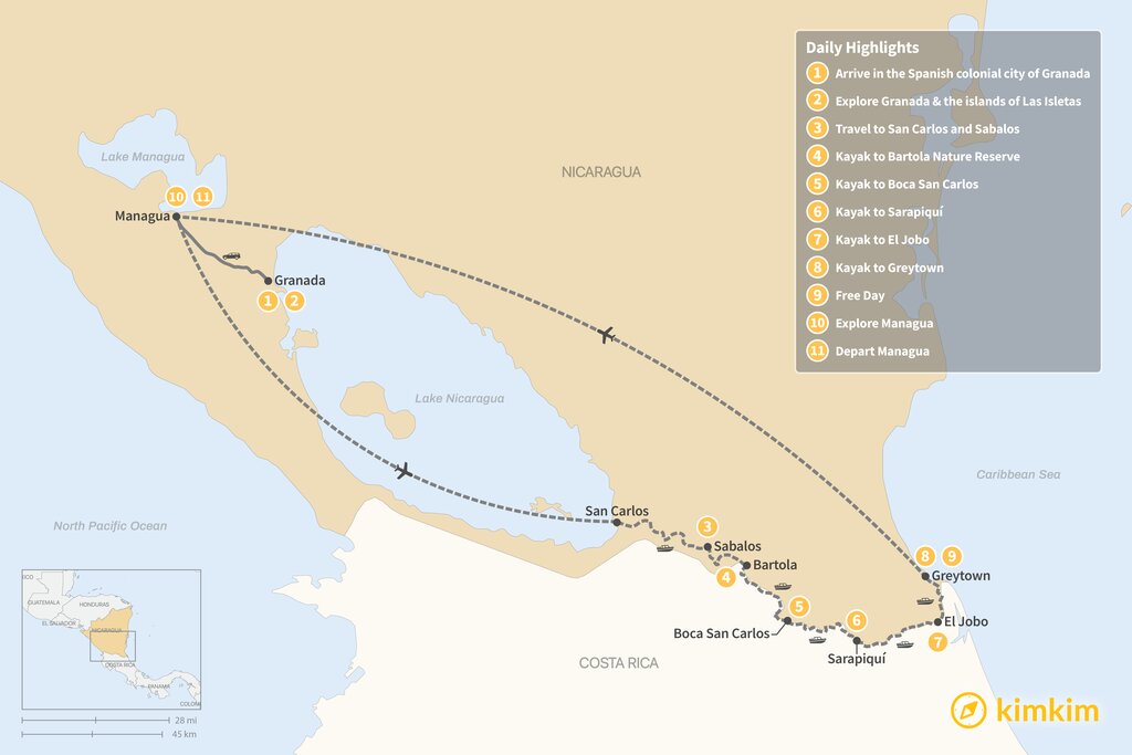 Map of Kayak the Pirate Routes in Nicaragua – 11 Days