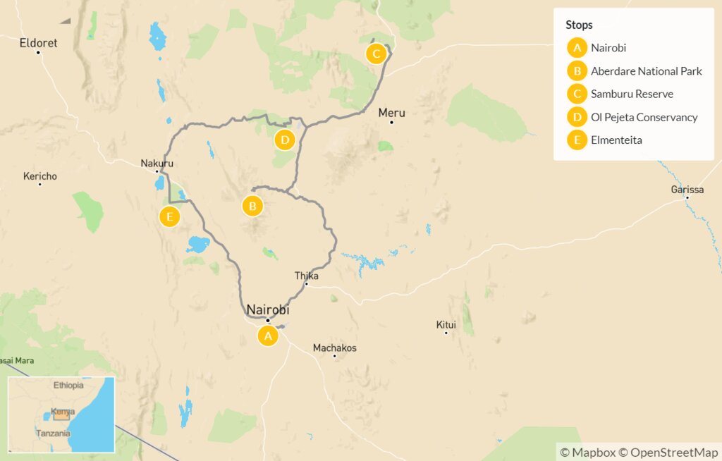 Map of Kenya Off-the-Beaten-Path Safari: Aberdare, Samburu, Ol Pejeta & Elmenteita – 10 Days