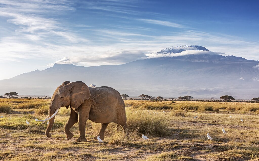 Leave Lake Naivasha early on a five-hour transfer south back to the border with Tanzania. Your destination is Amboseli National Park, which encompasses the foothills of mighty Mount Kilimanjaro, the highest peak in Africa (19,340 ft/ 5,895 m). Besides views of Kilimanjaro’s snowcapped cone, this 151 square-mile (392 square km) park features abundant wildlife. Mostly, Amboseli is famous for its large herds of elephants. The park’s open plains make it easy to spot these gentle giants as they move across the savanna.