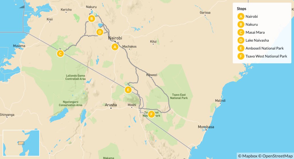 Map of Kenya Safari Highlights: Nakuru, Masai Mara, Naivasha, Amboseli & Tsavo — 14 Days