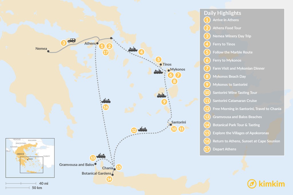 Map of Laid-Back Athens, Tinos, Mykonos, Santorini, and Crete – 17 Days