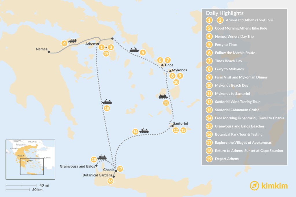Map of Laid-Back Athens, Tinos, Mykonos, Santorini, and Crete – 19 Days