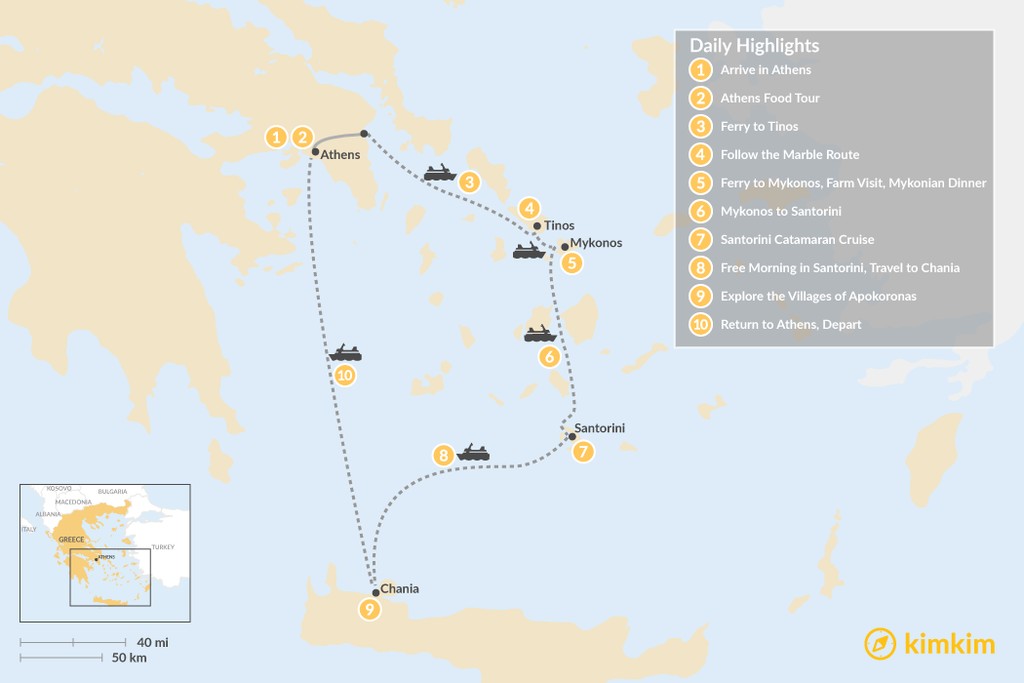 Map of Laid-Back Athens, Tinos, Mykonos, Santorini & Crete – 10 Days