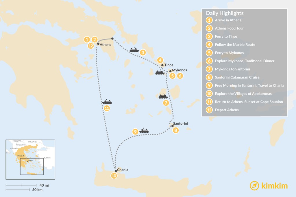 Map of Laid-Back Athens, Tinos, Mykonos, Santorini & Crete – 12 Days